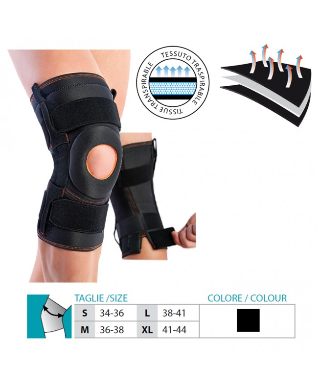 The Orione tubular knee brace in tri-layer fabric has a polycentric joint with rigid side splints.